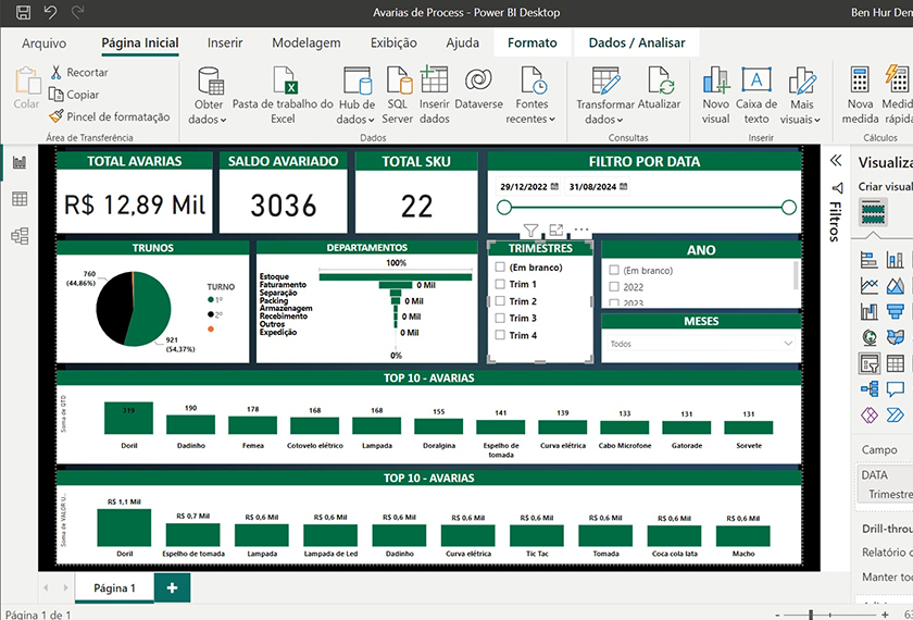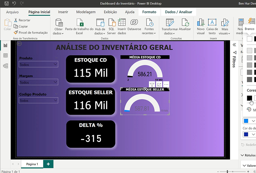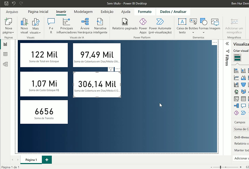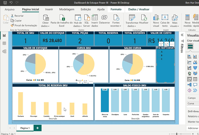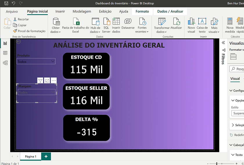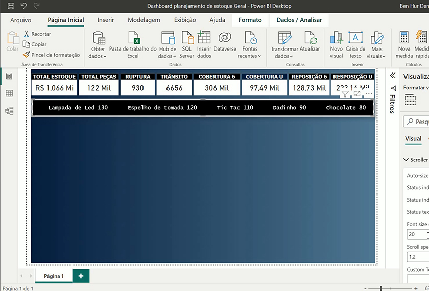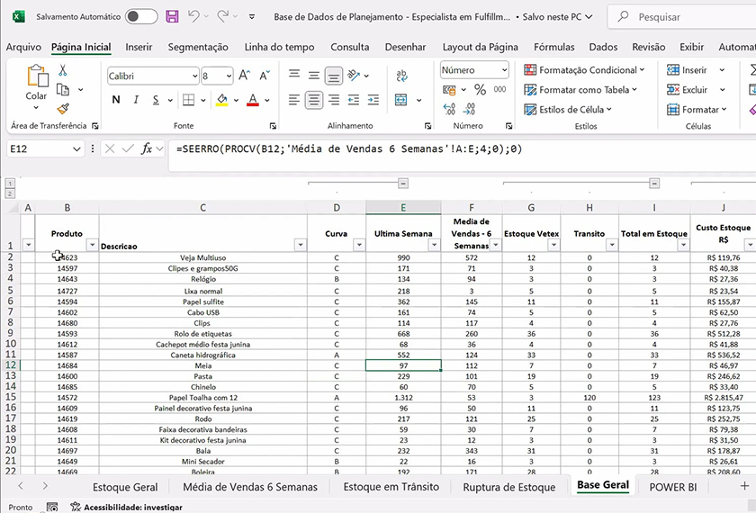 Você aprenderá a formatar bases de dados e a construir um dashboard completo de Planejamento de Estoque. O foco é na criação e formatação de cartões de indicadores, diversos tipos de gráficos visuais (Scrooler, Rosca e Barras) e, crucialmente, na criação de tabelas de coberturas e filtros interativos (segmentação e deslizamento) para uma análise detalhada.