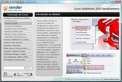 Neste módulo veremos os conceitos da folha de detalhamento, assim como a preparação do modelo a ser detalhado, inserindo as suas vistas padrões, organizando as suas dimensões e também abordaremos a configuração do formato da folha. Com o curso SolidWorks 2010 Detalhamento, você aprenderá a detalhar os seus projetos de uma forma rápida e completa, agilizando o seu trabalho no dia-a-dia. O curso abordará os detalhes de operações de comandos para dimensionamento, textos, lista de materiais, vistas de montagens, tabelas de furos, símbolos de tolerância e solda.